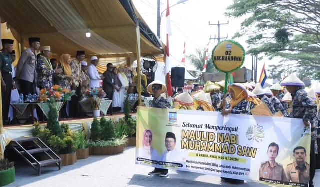 Kabupaten Serang, HALOBANTEN.COM – Pawai Peringatan Maulid Nabi Muhammad Saw Tahun 1445 Hijriyah tingkat Kabupaten Serang yang di ikuti seluruh organisasi perangkat daerah (POD) Pemerintah Kecamatan dan Badan Amil Zakat (Baznas) di Jalan Syech Nawawi Kecamatan Tanara berlangsung meriah pada Selasa, 3 Oktober 2023. Kemeriahan berdampak terhadap para pelaku usaha mikro kecil menengah atau UMKM terbantu, sehingga terjadi perputaran ekonomi di sekitar lokasi.
