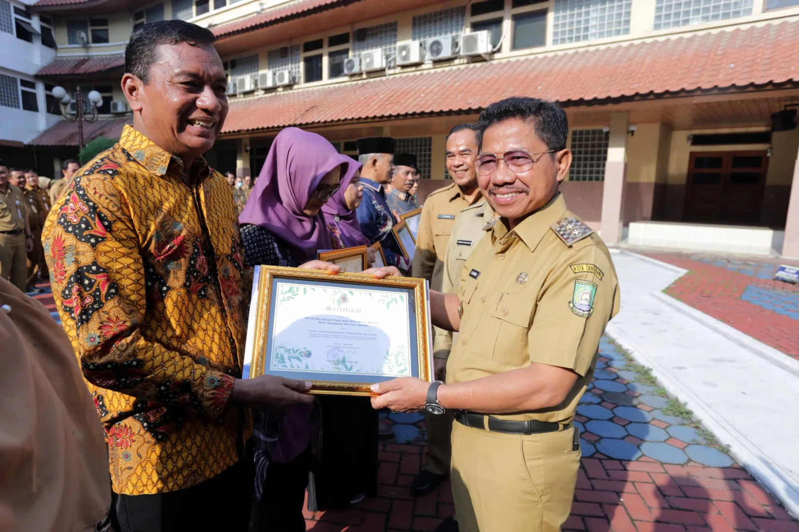 Piagam penghargaan dari Menteri KLHK Siti Nurbaya dan uang pembinaan sebesar Rp8 juta dari Pemerintah Kota (Pemkot) Tangerang diberikan oleh Wakil Wali Kota Tangerang Tangerang, Sachrudin kepada Ketua RW 04 yang juga menjabat Kanit Tuljawali Satlantas Polres Metro Tangerang Kota, AKP Subari, di Puspemkot Tangerang saat apel pagi, Senin (6/11/2023).