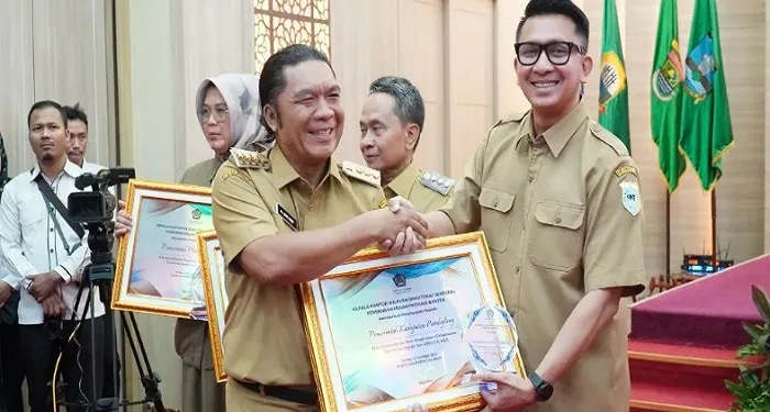Penyerahan penghargaan secara langsung diberikan Pj. Gubernur Banten Al Muktabar Kepada Wakil Bupati Pandeglang Tanto Warsono Arban di Aston Hotel Convention Serang, Kamis (21/12/2023).