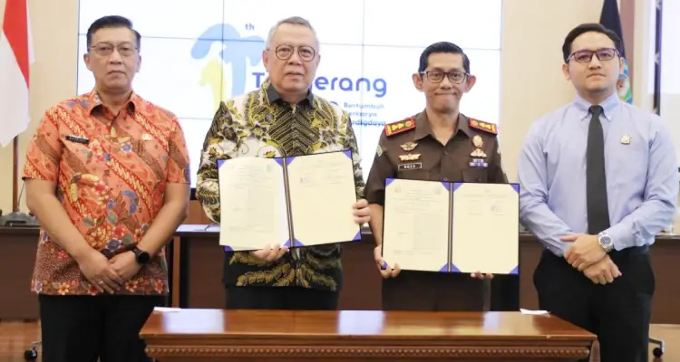 Penandatanganan perjanjian kerja sama berlangsung di Blandongan Puspemkot Tangsel, Kamis (16/4/2026). Wali Kota Tangerang Selatan Benyamin Davnie bersama Kepala Kejari Tangerang Selatan Apreza Darul Putra, hadir langsung dalam agenda tersebut.