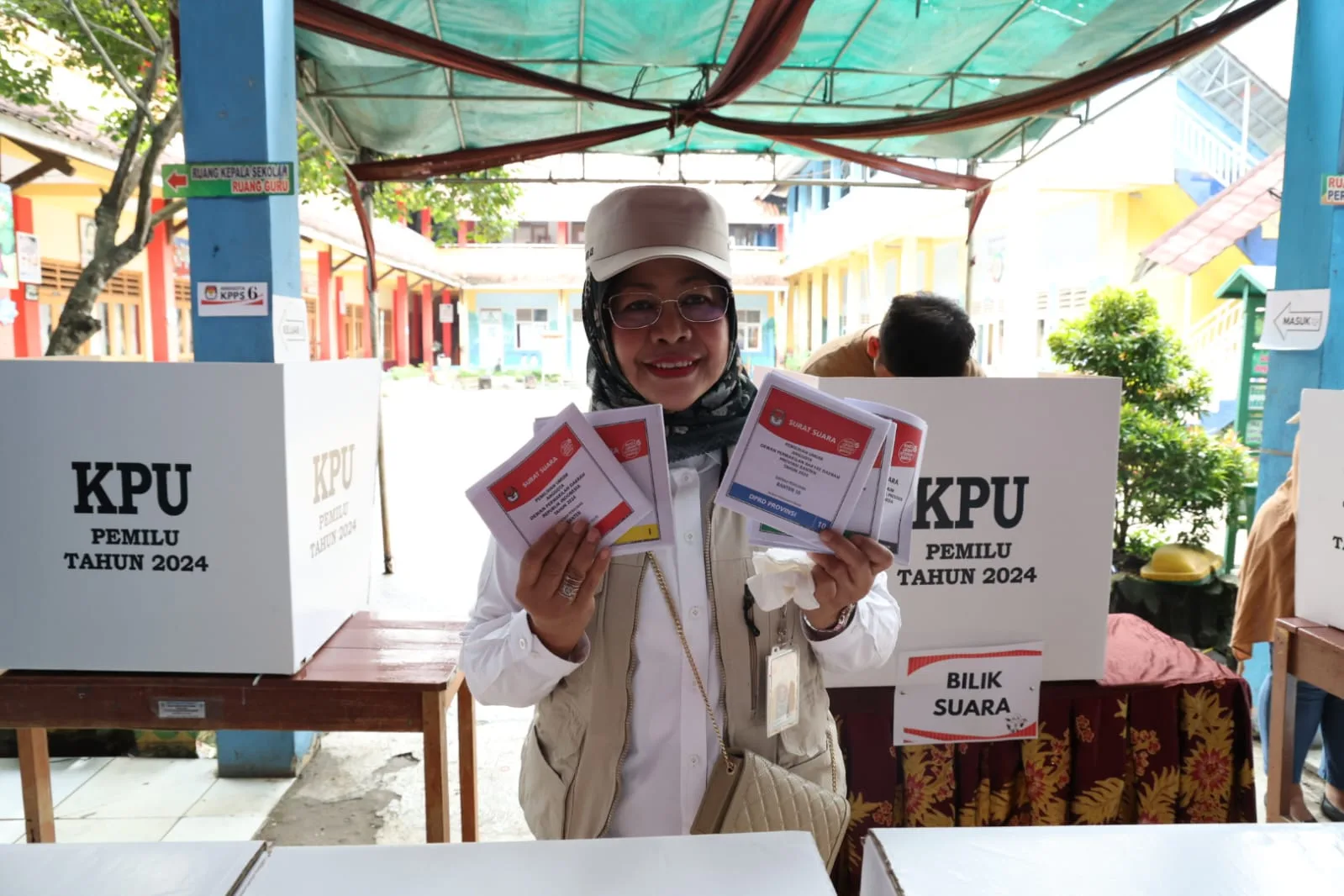 Rangkasbitung, HALOBANTEN.COM – Penjabat (Pj) Sekretaris Daerah (Sekda) Provinsi Banten Virgojanti, memberikan hak pilih suara di Tempat Pemungutan Suara (TPS) 15 Kelurahan Muara Ciujung Barat, Kecamatan Rangkasbitung Kabupaten Lebak, Rabu (14/2/2024).