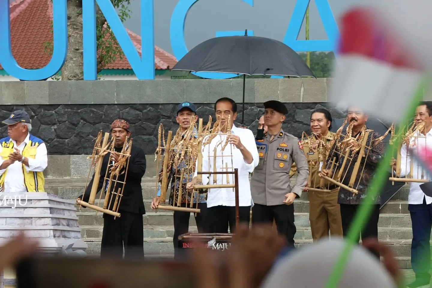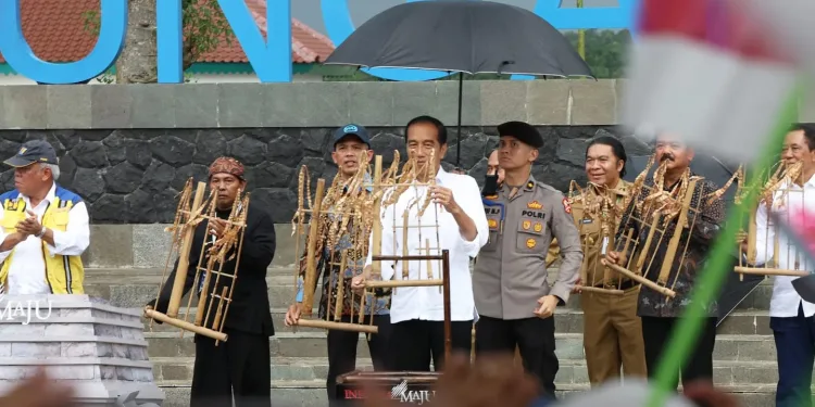 Lebak, HALOBANTEN.COM – Presiden RI Joko Widodo (Jokowi) meresmikan Bendungan Karian yang berlokasi di Kabupaten Lebak, Senin (8/1/2023). Jokowi didampingi Menteri PUPR Basuki Hadimuljono, Menteri Perdagangan Zulkifli Hasan, Menteri ATR/BPN Hadi Tjahjanto menggoyangkan angklung sebagai tanda diresmikannya Waduk Karian.