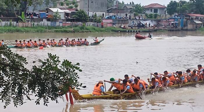 Mereka memadati sisi kiri dan kanan bantaran Sungai Cisadane untuk memberi semangat pada tim lomba perahu naga yang menjadi tradisi dan budaya khas Kota Tangerang