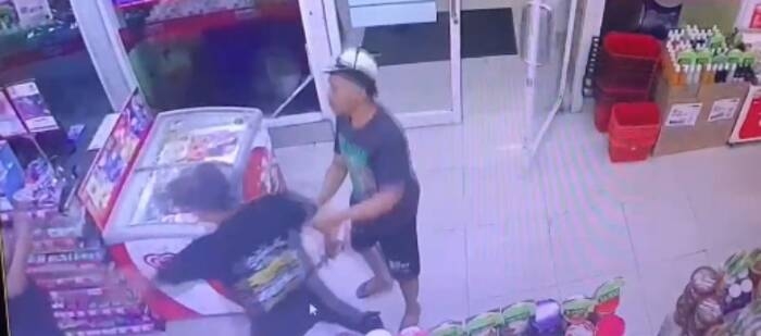 Namun aksi pelaku tampak dihalang oleh pria lain dan segera menariknya keluar minimarket.