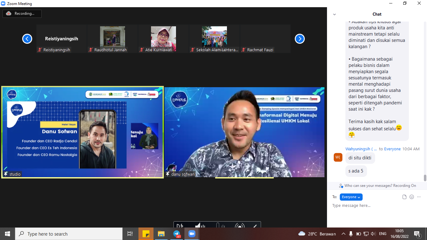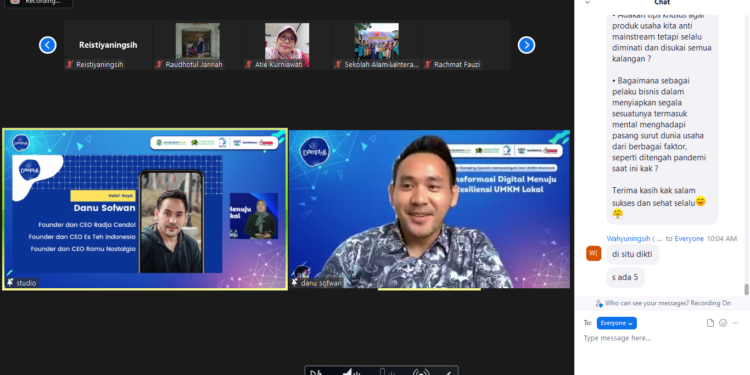 Webinar yang digelar Selasa, 16 Agustus 2022 bertema Transformasi Digital Menuju Resiliensi UMKM Lokal kali ini dihadiri oleh Asisten Deputi Pengembangan Teknologi Informasi dan Inkubasi Usaha Kementerian Koperasi dan UKM RI yakni Christina Agustin, Direktur Sustainable Development Danone Indonesia selaku Karyanto Wobowo dan Lily Zulaeha selaku Direktur Kampus Bisnis Umar Usman.